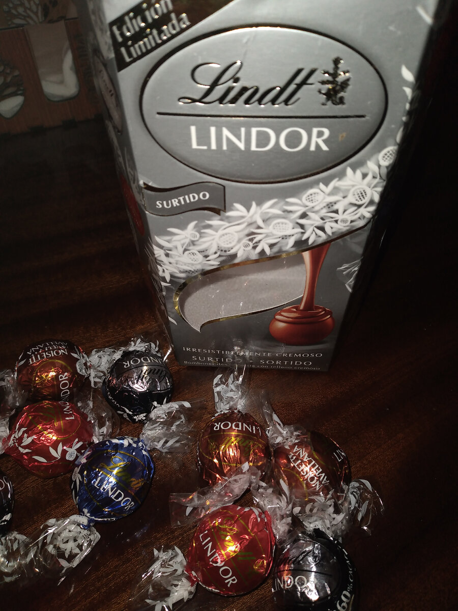 Из рубрики «Рецепты. Питание. Еда и напитки» Вконтакте Одноклассники Телеграмм Здравствуйте дорогие читатели и подписчики канала готовим вместе. Сегодня у нас на дегустации замечательные конфеты Линдор ассорти. Состав набора: Конфеты из молочного шоколада с нежной, тающей начинкой; Конфеты из молочного шоколада с кусочками фундука; Конфеты из темного шоколада 45% какао с нежной, тающей начинкой; Конфеты из горького шоколада 60% какао с нежной, тающей начинкой. Их вес составляет 200 г, поставляются в праздничной картонной упаковке. Внутри шоколадные шарики с начинкой, каждый в индивидуальной упаковке. Всего представлено четыре вкуса, которые отличаются цветами фантиков (красный, коричневый, чёрный и синий). Единственный минус этих конфет - это цена. В зависимости от жадности продавца: от 500 руб до 1.000 руб за 200 г. Это дорого, очень дорого. Если оценивать данные конфеты по пятибалльной шкале, я бы им поставил десятку. Очень вкусные, очень нежные, молочный шоколад просто восхитителен,