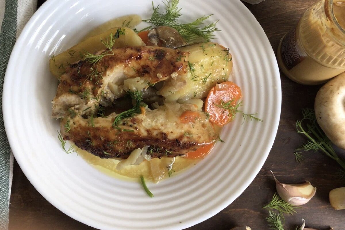 Здравствуйте, дорогие подписчики и гости моего канала. Мясо куриной грудки само по себе, сухое мясо, а если его ещё и запекать просто так, то получается просто “ бумажное мясо”. Поэтому я использую различные маринады для грудки. Но больше всего понравился маринад на основе мёда и горчицы. Именно эти продукты придают сочность и яркий вкус для мяса. Но соус я делаю сама, так как отлично знаю в каких пропорциях мёд и горчицу добавить в мясо. Да и про гарнир не надо забывать. Побольше овощей, это еще один плюс, чтобы получить блюдо вкусным. Первым делом приготовим первый маринад. В миске смешиваем чеснок, майонез. Соевый соус, горчицу в зёрнах и чёрный молотый перец. Всё хорошо перемешиваем. Данным маринадом хорошо обмазываем каждый кусочек куриной грудки и оставляем на 1-2 часа, чтобы мясо хорошо промариновалось. Для овощной подушки ( гарнир) я использую мороженные кабачки, картофель, грибы, лук и морковь. Овощи ( лук, грибы и кабачки ) надо предварительно обжарить. После э