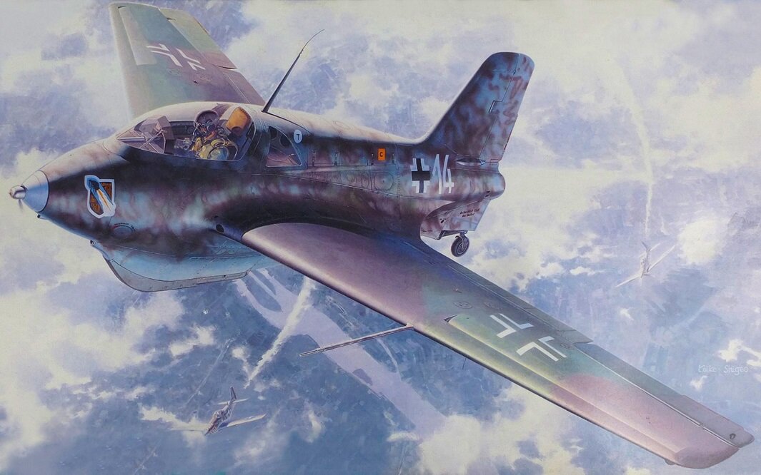 «Американцы начали интенсивную „ковровую“ бомбардировку городов Германии. Система ПВО не могла справиться, была малоэффективной, так как бомбардировка осуществлялась с больших высот. Нужен был перехватчик, способный в считанные минуты достигнуть высоты 8–9 км и атаковать строй бомбардировщиков. Возложенные на „ракетное чудовище“ надежды оправдались лишь частично. Из-за несовершенства двигательной установки начались частые аварии в воздухе и на земле. Однако удавалось сбивать даже „суперкрепости“ B-29. Поэтому эмблемой „отряда 16“ стала „реактивная“ летящая блоха на чёрном щите с девизом: „Блоха — флох, но кусает — ох!“»