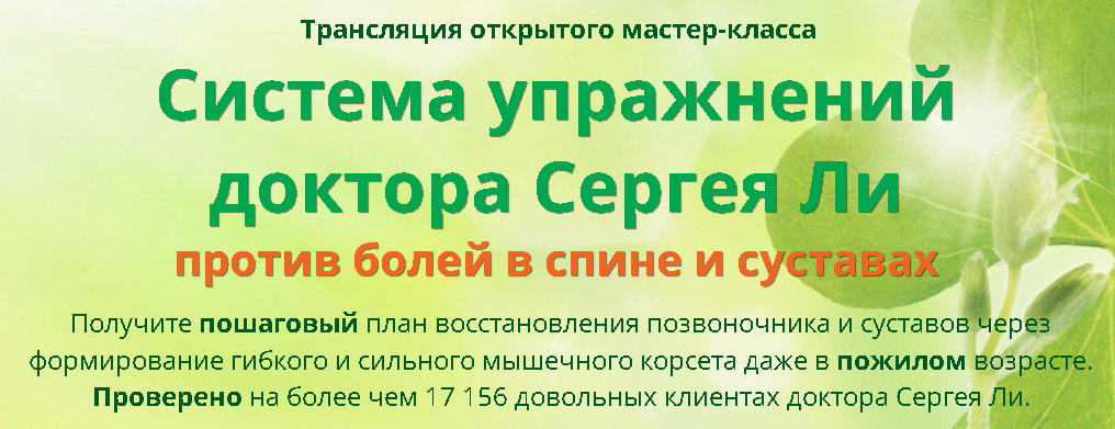 Проверено на более чем 17 156 довольных клиентах доктора Сергея Ли. 20 марта в 19-00 МАСТЕР-КЛАСС ЗДЕСЬ! Почему возникают боли в спине? Из-за искривлений позвоночника. В большинстве случаев "скрытых" искривлений. Проверить это просто. На мастер-классе Сергей вам покажет, как это сделать. Мышцы хронически зажаты, чтобы удержать "кривую" спину. Любое неловкое движение или холодный ветер - возникает воспаление - портится хрящ, и самое страшное - в любой момент может зажаться нерв. И тогда только операция спасет вас. Откуда появляются искривления? Причин масса, привычка - одна. И как вы понимаете: таблетки, мази, уколы, ЛФК, массаж, остеопаты не могут исправить эту привычку. И еще страдают колени. МАСТЕР-КЛАСС ЗДЕСЬ! А как возможно исправить привычку?