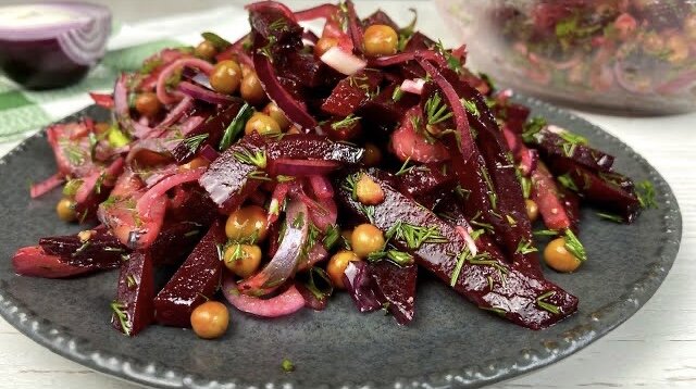 Этот салат что-то среднее между винегретом и сельдью под шубой, поэтому он — беспроигрышный вариант! Чтобы ускорить процесс приготовления, отварите свеклу с вечера. Но если вы не торопитесь подать салат к столу, то можете воспользоваться классным лайфхаком, который помогает приготовить свеклу за 10 минут. Расскажу о нем в статье. Кстати, этот салат может получаться каждый раз разным, если добавлять или убирать из его состава ингредиенты. Например, отварную картошку или соленые огурцы. Вы можете подобрать свое сочетание продуктов — поделитесь им в комментариях с нами:) Давайте готовить: Если нет времени или желания долго варить свеклу, записывайте лайфхак: в сырой свекле делаем много проколов деревянной шпажкой и отправляем в микроволновку под крышкой (или поместив в мешок) при самой высокой мощности на 10 минут. Время может быть увеличено, в зависимости от мощности микроволновки. Далее даем ей полностью остыть. Кожица чиститься очень легко. А пока свекла готовится и остывает, нарезаем
