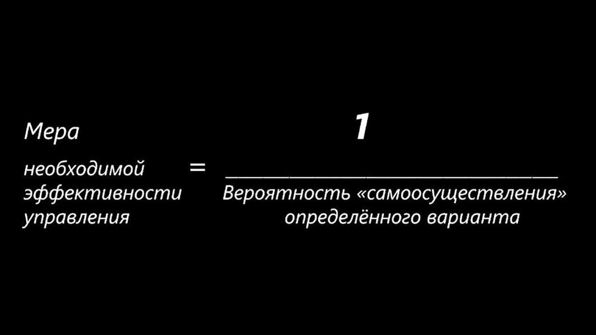 Поэтому, если представить, что на одной чаше весов лежит 1.0 — вероятностная предопределённость определённо неведомого будущего вообще, то на другой чаше весов в таком представлении должно лежать множество более или менее детально определённых — и соответственно отличимых один от другого — вариантов этого «будущего вообще». При этом каждый из этих вариантов, можно избрать в качестве вектора целей управления.