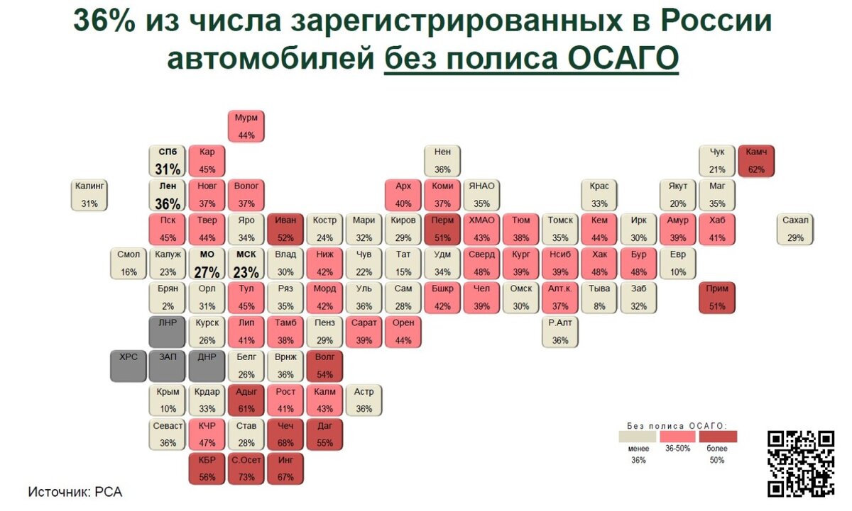 1. Каждый третий (в среднем) автомобиль в России не имеет полиса ОСАГО.