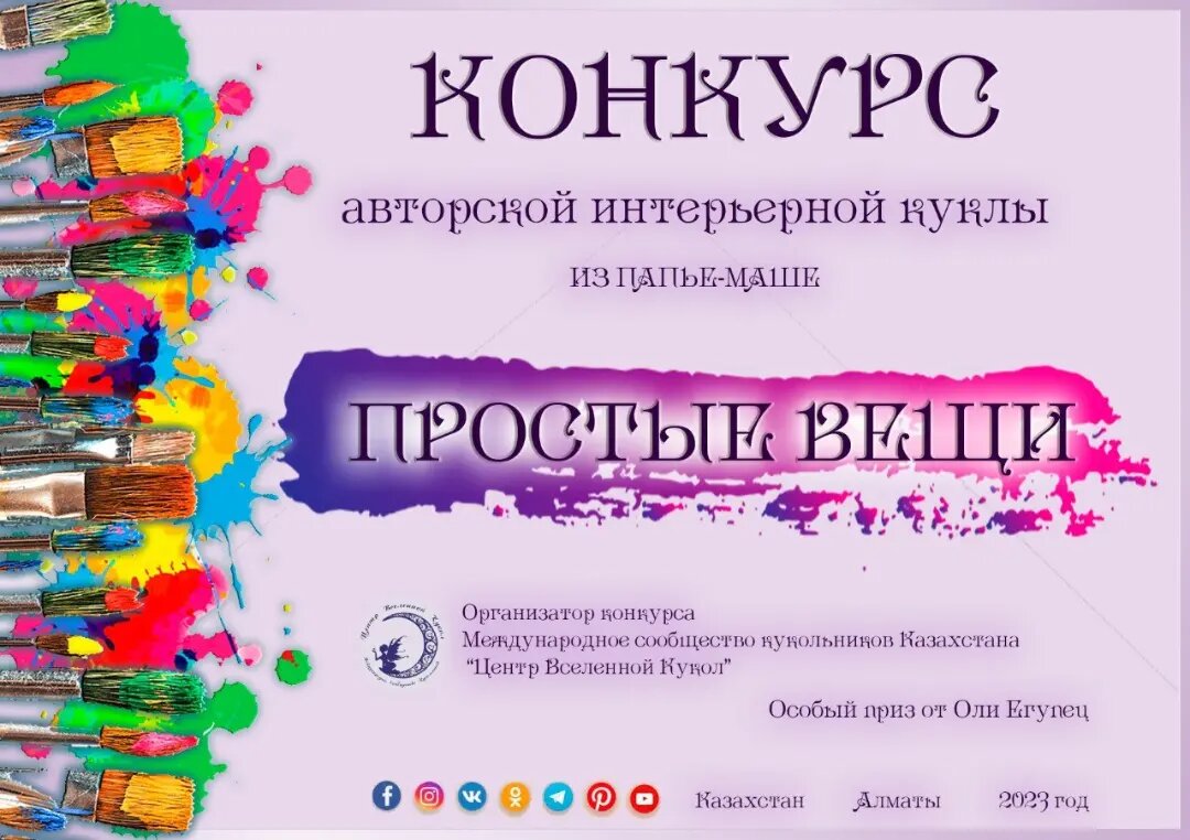 В рамках конкурса принимаются работы выполненные из папье маше на тему «Простые вещи». Мы привыкли к окружающим нас вещам, и практически не замечаем их. А многие вещи стали для нас раритетом и мы их воспринимаем как историю. Пуговица, скрепка, кнопка, утюг, иголка, наперсток, швейная машина, радио, молния. А кто-то помнит, как пользоваться ручной кофемолкой или плёночным фотоаппаратом? Организаторы конкурса: Особая изюминка конкурса - это суметь сделать работу, но и ещё поделиться историей простой вещи. И порой прочитав историю работа становится намного интереснее. Более подробно все работы участников вы можете посмотреть на странице сообщества в контакте Сроки проведения конкурса с 5 января 2023 года до 31 мая 2023 года. Работы принимаются до 20 апреля 2023 года Подведение итогов с 1 мая 2023 года по 20 мая 2023 года. В случае продления сроков приема заявок и конкурса организаторами производится объявление на электронных ресурсах организаторов. Публикация результатов конкурса с 20