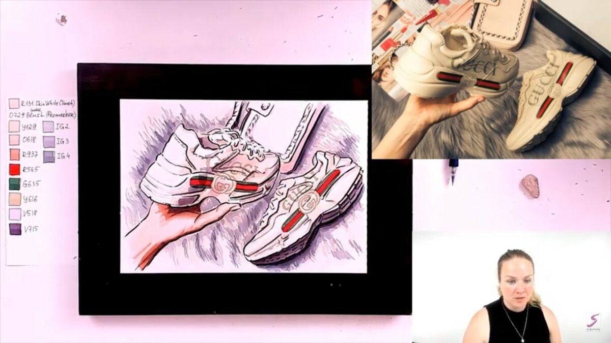 Жанр этой работы – fashion-иллюстрация. Вы узнаете, как нарисовать кроссовки известного модного бренда Gucci. Мы возьмем не все предметы с референса, чтобы оставить и усилить акцент именно на обуви. Не бойтесь сложного ракурса: преподаватель подробно расскажет, как передать этот разворот и выполнить рисунок интересно и выразительно. Кроме того, вы узнаете, что такое стилизованная иллюстрация и как добиться этого эффекта.