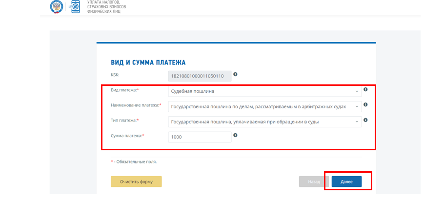 В своем письме ведомство, учитывая переход на ЕНС с 2023 года, указало на то, что согласно положениям Правил указания информации в реквизитах распоряжений о переводе денежных средств от 12 ноября 2013 г. № 107н. при составлении платежного поручения на уплату государственной пошлины по делам, рассматриваемым арбитражными судами, следует указывать: Какие реквизиты указывать при перечислении ЕНП - рассказывается в материале «Платежное поручение по ЕНП». Также ведомство напомнило, что на официальном сайте ФНС России в разделе «Сервисы и госуслуги» размещен интернет-сервис «Уплата налогов и пошлин», благодаря которому можно: Сервисом могут воспользоваться физические лица, компании и ИП. Для того, чтобы сформировать платежку или осуществить оплату госпошлины нужно: 1. Выбрать из перечня необходимый вид платежа, наименование, тип платежа и указать сумму; 2. После нажатия «Далее» в новом окне указать регион и код «ОКТМО» 3. В следующем окне указать: 4. После заполнения всех реквизитов появится