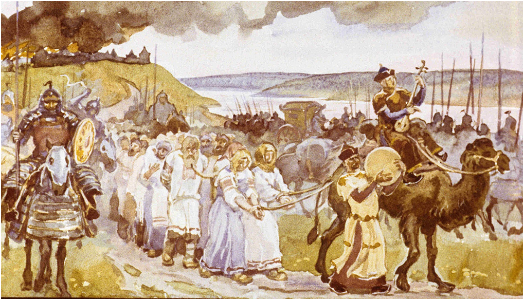 Так выглядят отношения Хазарского каганата со славянами в глазах публицистов и авторов художественных книг на исторические темы. Особенно популярно это мнение о Каганате среди последователей, так называемого «родноверия». Но на чем же кроме фантазии, основывается утверждения о жутком угнетении восточных племен славян, хазарами? А подтверждением является одна единственная фраза из Радзивиловской летописи. Там действительно написано, что хазары брали по «белой девице» от дыма и даже картинка соответствующая есть. Беда, в том, что в остальных летописях имеется другая информация. Согласно всем источникам хазары собирали со славян по: «щелягу с плуга», «серебряной монете и белке от дыма», «белой веверице от дыма», «белой векше». Как видите, ни о каких девицах речи не идет.