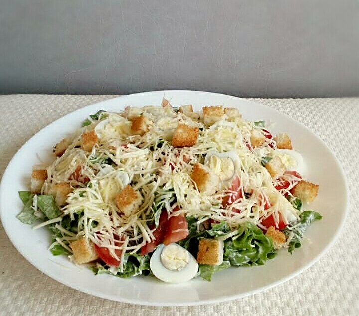 Готовила с таким соусом впервые, может и не самый оригинальный вариант рецепта, но получилось по-домашнему вкусно. Ингредиенты: - листья салата - куриное филе - 1 помидор (лучше черри 6 - 8 шт.) - 6 - 8 перепелиных яиц (если нет, можно взять 2 шт. куриных😉) - 3 кусочка батона - майонезный соус "Цезарь" (если нет, делаем соус самостоятельно: 3 ст.л. майонеза, 1 зубчик чеснока, зелень укропа, 1 ч.л. лимонного сока) Приготовление: - батон нарезать на кубики, обжарить на СУХОЙ сковороде до золотистого цвета - яйца отварить, очистить и нарезать пополам - помидор нарезать дольками - твёрдый сыр натереть на мелкой тёрке - куриное филе посолить, поперчить, добавить приправу для курицы и обжарить на растительном масле - листь салата промыть, обсушить и порвать руками в миску, добавить куриное филе и соус, перемешать - на блюдо выложить салат с соусом и курицей, сверху разложить яйца и помидор, посыпать сыром, украсить сухариками Приятного аппетита! Благодарю за ваши комментарии и лайки❤