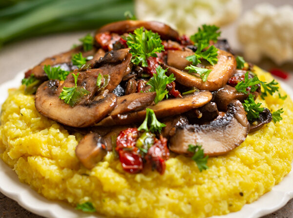 Хороший способ насладиться грибным рагу подать его с гарниром из цветной капусты и кукурузной крупы, что делает это блюдо ещё полезнее и богаче питательными веществами! Вы можете приготовить гарниро из цветной капусты и кукурузной крупы, используя обычную воду, но лучше вместо этого использовать куриный или овощной бульон (в зависимости от ваших вегетарианских предпочтений), так как это придаст блюду особый аромат.