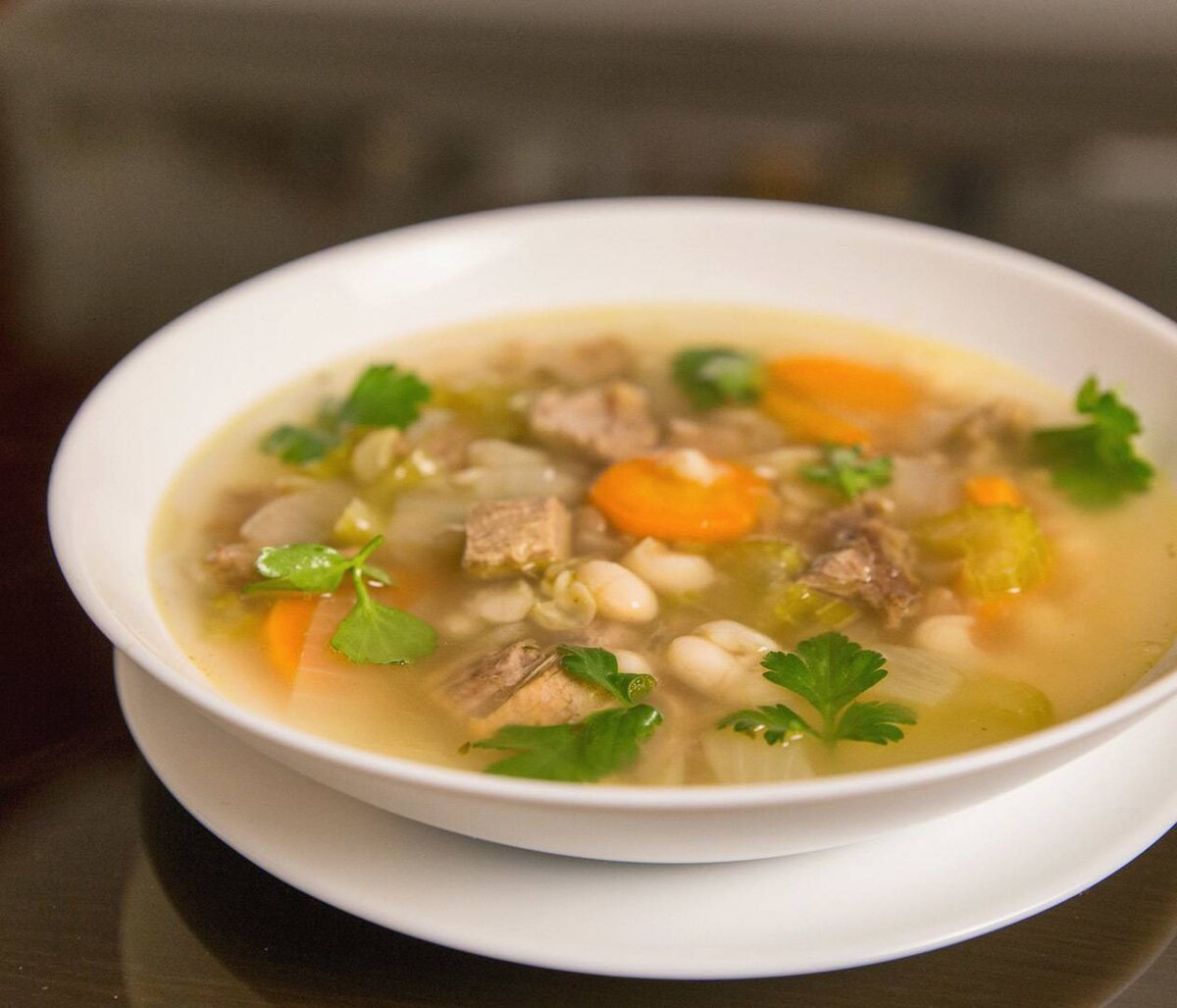 Мясо отварить целым куском. Потом его разобрать на кусочки. Морковь нарезать кружочками и выложить в бульон вместе с мясом. Через 10-15 минут кладём белую фасоль из банки вместе с соусом и дать покипеть 10 минут. Добавить лавровый лист, соль, 5 горошин душистого перца, рубленую зелень и дать вскипеть 2 минуты. Супчик готов, всем приятного аппетита!