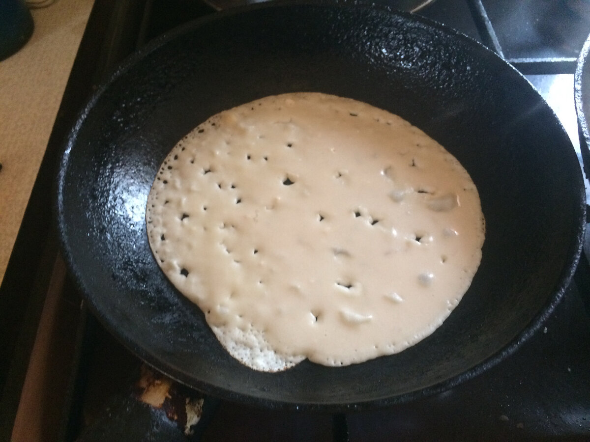 Блинчики такой универсальный продукт: подойдут и на второе - если с мясом или рыбой да под соусом типа песто или бешамель, и к чаю с мёдом или вареньем, можно и не сладкие, просто со сметаной. Могут быть и калорийными с яйцами и молоком. Но и не калорийные без яиц и на воде, с небольщим добавлением в тесто растительного масла, не менее вкусные. Но зато такие блины удобно употреблять в пост, и без излишеств, и натуральный растительный продукт. Готовлю сегодня блинчики с топинамбуром. Проверяю, насколько топинамбур, как начинка, будет похож на картошку. А ещё мне нужно приготовить что-то очень быстрое. на скорую руку, а топинамбур, как я уже писала, и варится и жарится очень быстро. Буквально 5 минут. Для блинов беру муку, воду, соль, треть чайной ложки соды. Всё на глаз, тесто жидкое, как кефир, может чуть погуще, поскольку блинчики буду делать тонкие. Быстро замешиваю венчиком, но без миксера. Взбивать мне не надо, а комочки прекрасно разобьются. Одновременно тру на тёрке топинамбур.