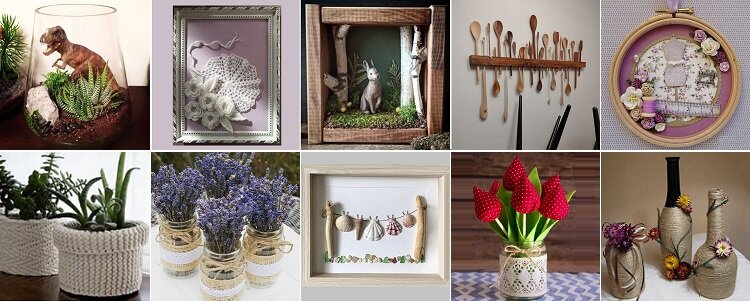 Хотите сотворить для интерьера что-то не слишком сложное в работе, но вместе с тем достаточно достойное? Это возможно! Сушеный декор Букетики из сухоцветов или наборы из сушеных пряностей и фруктов — пожалуй, самые простые варианты для создания декора. Букет можно поставить в банку, декорированную джутом и мешковиной. Набор из пряностей и сухофруктов — сложить в банку для сыпучих. Лучше приобретать профессионально высушенные цветы и фрукты в магазинах для флористики. Флорариум В ассортименте емкостей для флорариумов есть формы и размеры буквально на любой вкус. Ассортимент фигурок диких животных и искусственных суккулентов также огромен. Цветные грунт, песок, кора, щепа и камни сегодня тоже не проблема. Объемные картины Здесь главное, чтобы был тот, кто сможет сделать вам основу-заготовку в виде глубокой рамки с задней стенкой. Для фона-обоев можно использовать бархатную бумагу или бумагу с принтом для скрапбукинга. Весь остальной сюжет будет зависеть от имеющихся в наличии фигурок и м