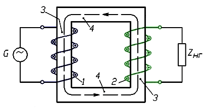 1 — Первичная обмотка 2 — Вторичная обмотка 3 — Сердечник магнитопровода 4 — Ярмо магнитопровода