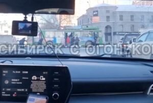 Пассажиры протащили сломанный троллейбус по оживленному перекрестку в Новосибирске