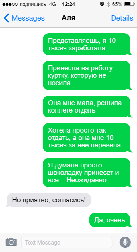 Порой при наличии основной работы тяжело найти хорошую и адекватную подработку: то график не подходит, то расположение неподходящее и придется на дорогу тратить кучу времени, то слишком много требований при небольшой зарплате. Поэтому очень приятно отыскать дополнительный источник заработка. Иногда удается заработать деньги совершенно неожиданно, когда совершенно не рассчитываешь на какую-то прибавку в бюджет. О таких случаях я и решила рассказать, составив данную подборку с переписками. Совершенно реальный случай, который произошел со мной пару месяцев назад. Я вообще не рассчитывала ни на что. кроме "спасибо", когда приносила ненужную куртку коллеге. Ну, максимум, на шоколадку в качестве благодарности, а тут... Потратила полученные деньги на поездку в другую область, поход в музей и на концерт. Все остались очень довольны этой сделкой. Иногда так хочется вспомнить название песни или хотя бы исполнителя, но не получается, а мотив так и крутится в голове... Не удивительно, что человек