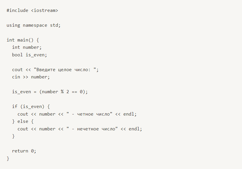 Рассмотрим пример использования булевого типа данных в C++. Допустим, у нас есть программа, которая проверяет, является ли число четным или нечетным. Для этого мы можем использовать оператор % (остаток от деления) и булевый тип данных.