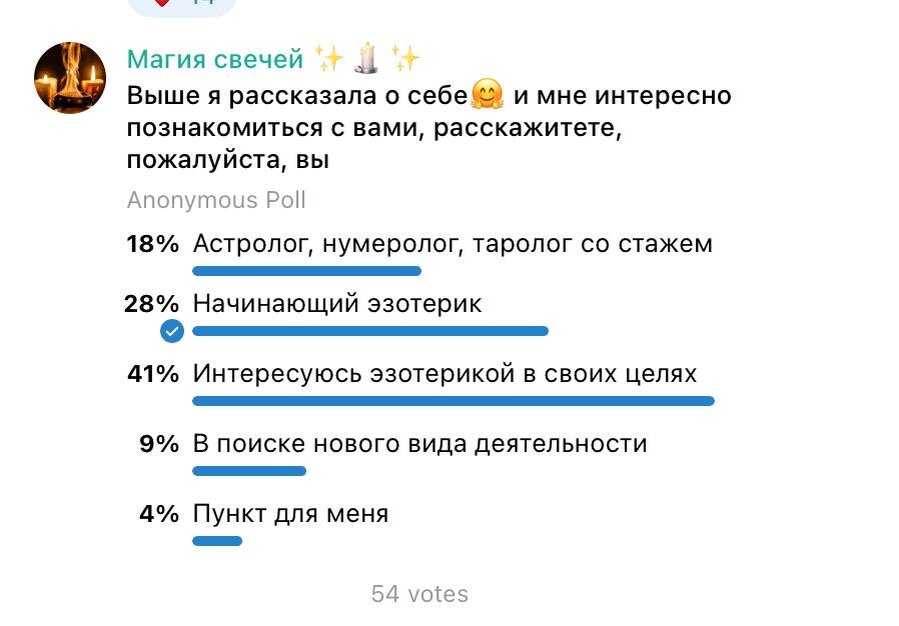 В инвайте есть две составляющие: - хорошая аудитория - продукт, который вы этой аудитории предлагаете Если эти два фактора отработаны на 100 баллов случается мэтч 🔥 Так произошло в нашем проекте на эзотерику "Магия свечей" (https://t.me/magicsvechi) #кейсы Аудитория была на 10000% понятная, и я знала где ее собрать. Собрала в итоге аж 10 000, но в паблик залили только 1000 😌 Так что эзотерики, если что у нас осталось 9000 классной аудитоиии 🙊 Сам продукт, стиль ведения контента для этой аудитории оказался супер подходящим. Тут целиком и полностью заслуга эксперта. Нами была дана только схема постов, а также небольшие замечания перед стартом - что и где поправить. С нас трафик, с вас проработанный понятный продукт и вуаля = случается мэтч. Уже с 1000 людей (хотя обычно для активности с инвайта нужно хотя бы 2-3 тысячи человек) началась движуха в чате. Реакции, комментарии, ответы на опросы. По 50-40 человек приходит на опросы. По 20-30-40 человек оставляют реакции. Желаем наш
