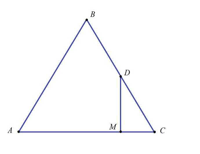 Некоторые свойства прямоугольных треугольников Уважаемые мамы и папы, дедушки и бабушки! Предлагаю вспомнить некоторые свойства треугольника на примере решения задач 258 и 256 из 9-го издания учебника по геометрии для 7-9 классов авторов Л. С. Атанасян, В. Ф. Бутузова, С. Б. Кадомцева, Э. Г. Позняк и И. И. Юдиной под научным руководством академика А. Н Тихонова. Условие задачи 258: Из середины D стороны BC равностороннего треугольника ABC проведён перпендикуляр DM к прямой AC. Найдите AM, если AB = 12 см. Решение: Рассмотрим треугольник MDC. Из условия задачи нам известны величины двух углов и длина гипотенузы: угол M – прямой, так как DM – перпендикуляр к прямой AC, угол C – 60°, так как треугольник ABC – равносторонний, и сторона DC – 6 см, так как D середина стороны BC равностороннего треугольника ABC, все стороны которого по 12 см. 1) Согласно первому свойству прямоугольных треугольников (глава IV §3 п.35 учебника на странице 75) сумма двух острых углов прямоугольного треугольника