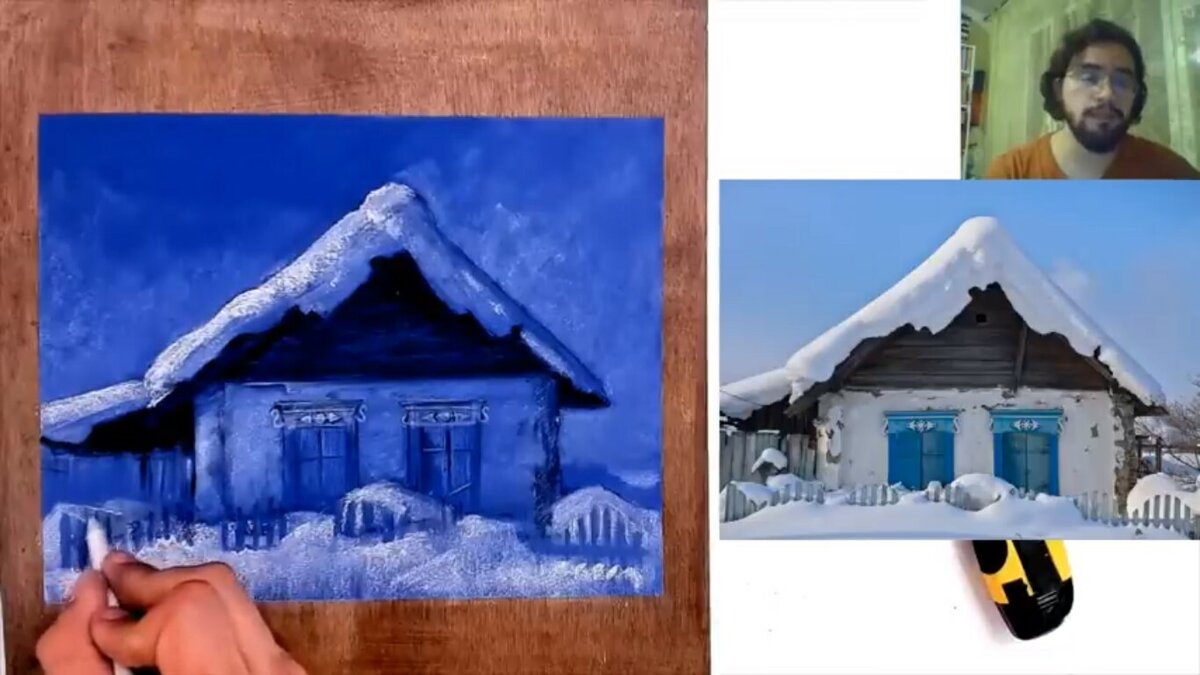 Самый простой ракурс, с которым справится любой новичок – это фронтальный. На бесплатном уроке Романа Круглова мы нарисуем дом, расположенный прямо перед нами, что избавит вас от сложностей передачи линейной перспективы и сокращений размеров, связанных с ней. Это будет типичный деревенский домик, которому еще больше очарования придает живописная шапка снега на крыше.