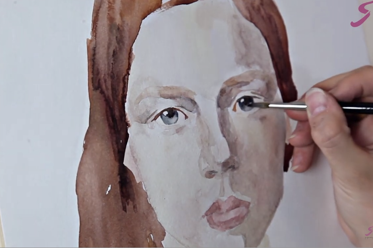 Раскрыв основные цветовые соотношения на лице, можно приступить к пятну волос: определить, насколько оно плотнее лица, какое по цвету и тону. В качестве основного цвета здесь подойдет сиена натуральная. Начинаем с теменных бугров, самой широкой части головы, поскольку в этом месте наблюдается перелом формы: верхняя плоскость освещена больше, чем боковые. Выставляем эти темные акценты.