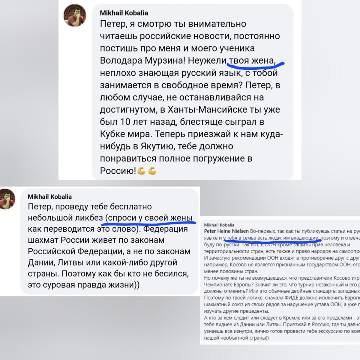 Во-первых, регулярно приходит в фейсбук Петера Нильсена и рассказывает датскому гроссмейстеру про его русскоговорящую (в том числе) жену. Ну, это проявляет лишь явную неудовлетворённость в личной жизни. Прочие комментарии что Михаила Кобалии, что его российской жены/сожительницы (есть ещё грузинская - но это уже их личное дело) очень характерны в этом свете. Кто бы мог подумать: высокие доходы за служение режиму не приносят людям счастья. Во-вторых, выделенные нами комментарии стоит прочитать внимательно по одной, но важной причине: образ Кобалии для "широкой общественности" сильно искажён его подписью под письмом от 03.03.22 "против войны". Вообще, они все, работники ФШР, уверены, что выписали себе тем письмом индульгенцию "на потом".