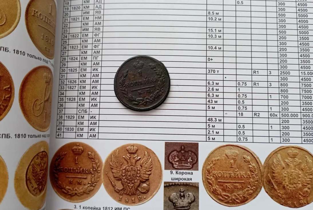 Вот, например, попадается копеечка периода 1810-1830 годов. Я точно знаю, что в этом периоде есть редкие монеты. Я их никогда не запоминал, а потому мне проще открыть каталог и убедиться - есть ли там, к примеру, буква R.