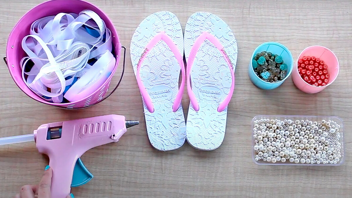 Попробуйте покрасить подошву шлепок влагоустойчивой износостойкой краской и смешать разные цвета шелковых лент для создания своей уникальной пары обуви.
