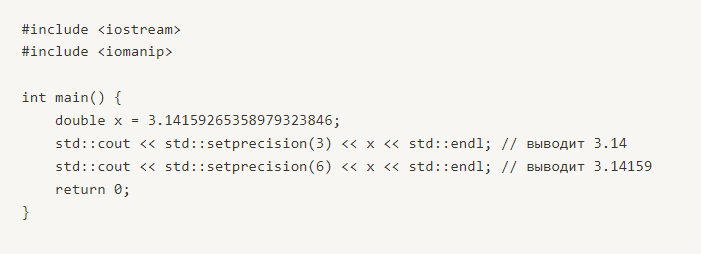 В этом примере мы используем функцию setprecision() для установки точности вывода переменной типа double до 3 и 6 знаков после запятой соответственно.