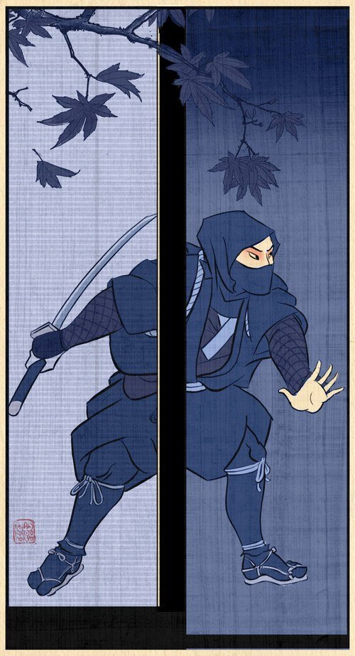 Это пример использования ин-нин в начале, и ё-нин в конце. Кроме того, Котаро, когда он проник в замок Миэороси в Санагу нашей провинции Ига, был допрошен и преследуем своим врагом. Убегая, он бросил камень в колодец, так что преследователи были введены в заблуждение, думая, что он мог туда упасть. Выиграв время, он сумел скрыться.