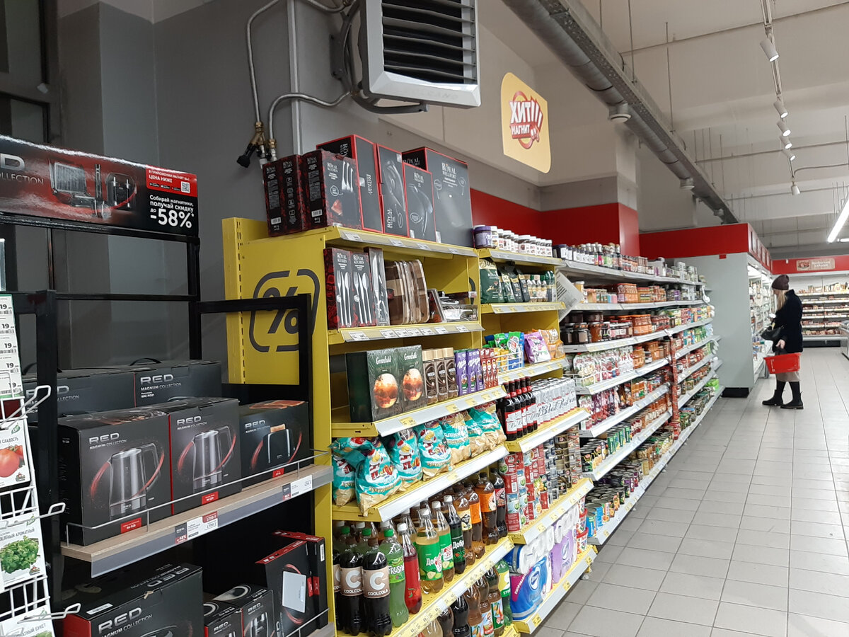 Начинаем со входа) Тут у нас скидки до -83%, причём, не на еду) Да-да, не хватило желающих с фишечками и наклейками на все товары Роял Кучен, зато теперь их можно брать всем, кто захочет.