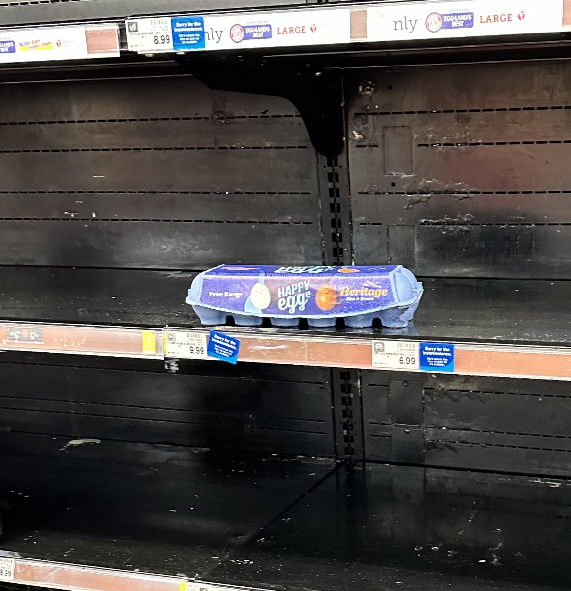 Многие ретейлеры смогли быстро перестроиться и найти новых поставщиков. Цены потихоньку возвращаются к $4-5 за дюжину яиц, в некоторых магазинах еще держатся в районе $6-7. В супермаркете, где обычно закупаю продукты, заветные коробки уже не тают, как раньше, но вечером пару раз натыкалась на пустые полки. Ну или на такую коробку, что выше на фото.