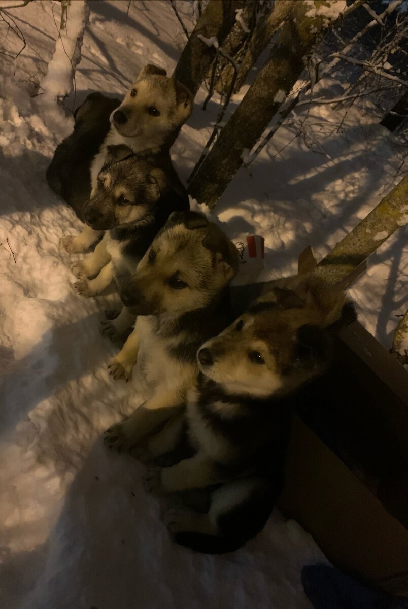 Когда Вика принесла еду щенкам, то выскочили еще два щеночка. Вообще неизвестно сколько их всего.