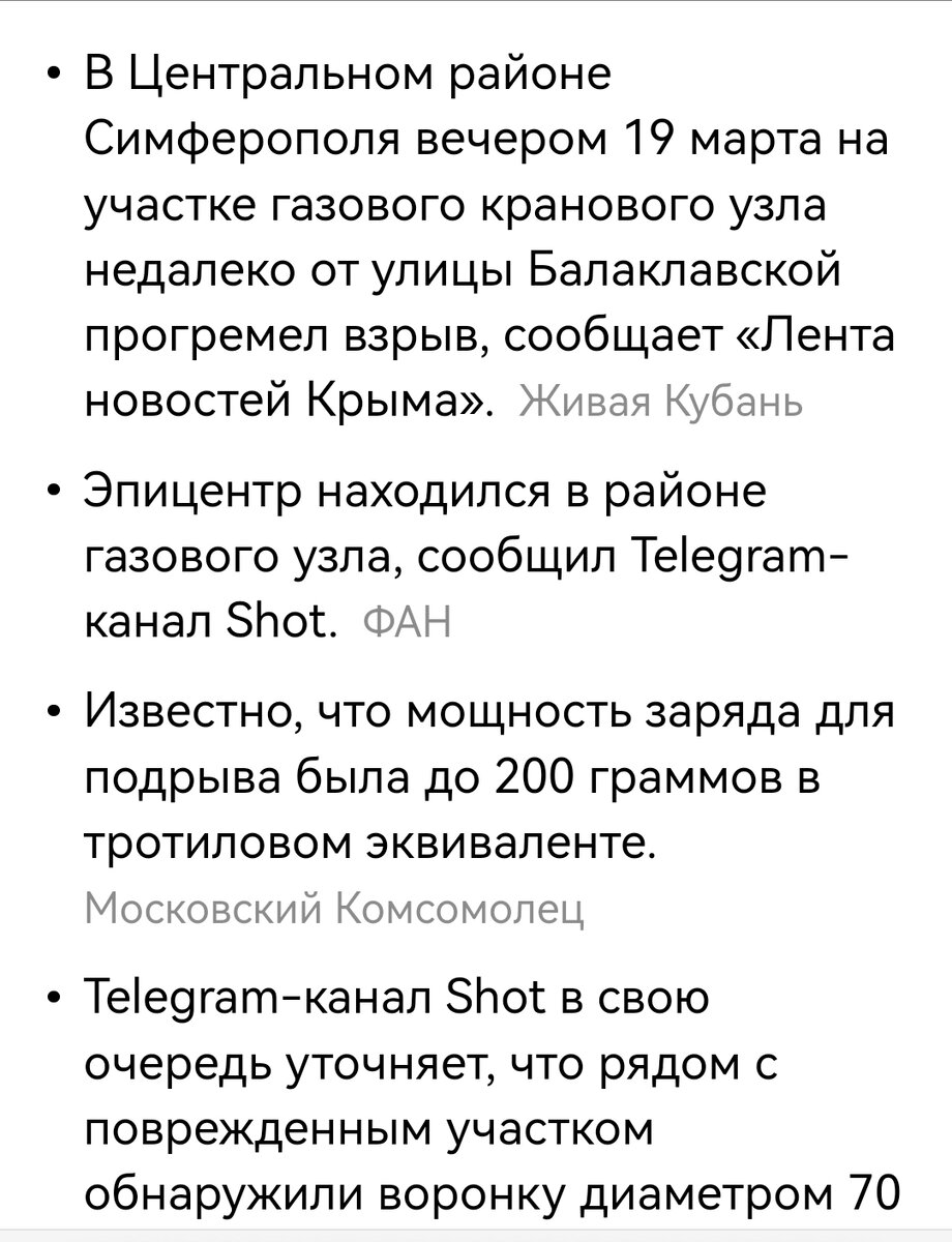 В Телеграм я у себя вчера закинула видео о подрыве газовой трубы в Симферополе. Никто не пострадал, но.... У мужика теперь нет прицепа, но все это фигня. Уже ночью решила глянуть, что нового у Аксенова Правда, непонятно, что сбили В комментариях на странице у него в ВК прочитала, что Шарий написал, что один погиб..... Я вот думаю - в Испании или где он там живет, землетрясение не прогнозируют? Или цунами? Вообще, в последнее время всякого понемногу происходит... У нас недавно тоже сбивали.... Мой Телеграм Мой Паблико Мой канал для опубликования информации и отчетов Мой канал о быте, домашних делах, ремонте Ещё один канал Буду рада поддержке канала в виде подписки и лайков