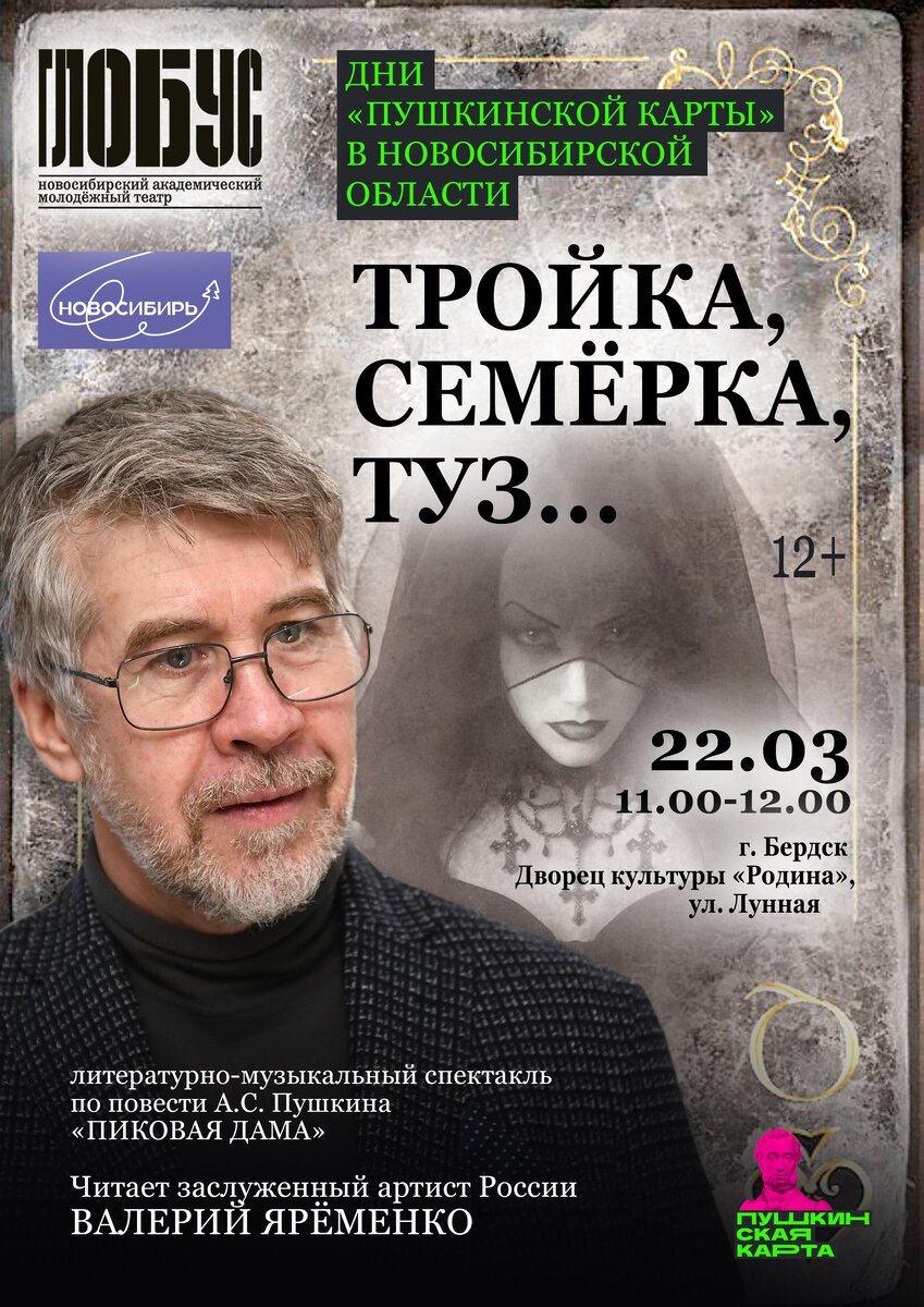 «Тройка, семерка, туз…». Литературно-музыкальный спектакль. Проект «Дни «Пушкинской карты» в Новосибирской области». Заслуженный артист России, актер Театра имени Моссовета, звезда мюзиклов и телевизионных шоу Валерий Ярёменко представляет публике осмысление известного произведения Александра Сергеевича Пушкина «Пиковая дама». Это история о порочности людей, о смысле жизни и путях достижения личных целей. Автор затронул глубокую философскую проблему: подлость и обман, на которые человека толкает алчность, приводят к неоправданным жертвам. Главная мысль повести – не все средства хороши при достижении своей цели, да и сама цель сомнительна – разбогатеть любой ценой… МАУ «Дворец культуры «Родина» г. Бердск, ул. Микрорайон, 48Б Сайт: https://rodinaberdsk.ru ВК: https://vk.com/dkrodina.berdsk ОК: https://ok.ru/group/70000001492132 КУПИТЬ БИЛЕТ ОНЛАЙН: https://globus-nsk.ru/bilety/kupit/?id=13324077 12+ Реклама Источник: сайт Бердск-Онлайн