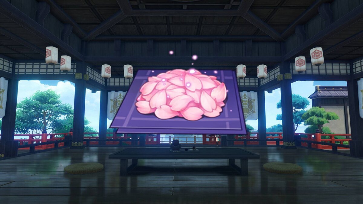 Цвет сакуры похож на небольшой электрический шарик, парящий воздухе. Чтобы собрать его, достаточно лишь повзаимодействовать любой Электро-атакой. Это может сделать, например, Лиза и Электро ГГ.
