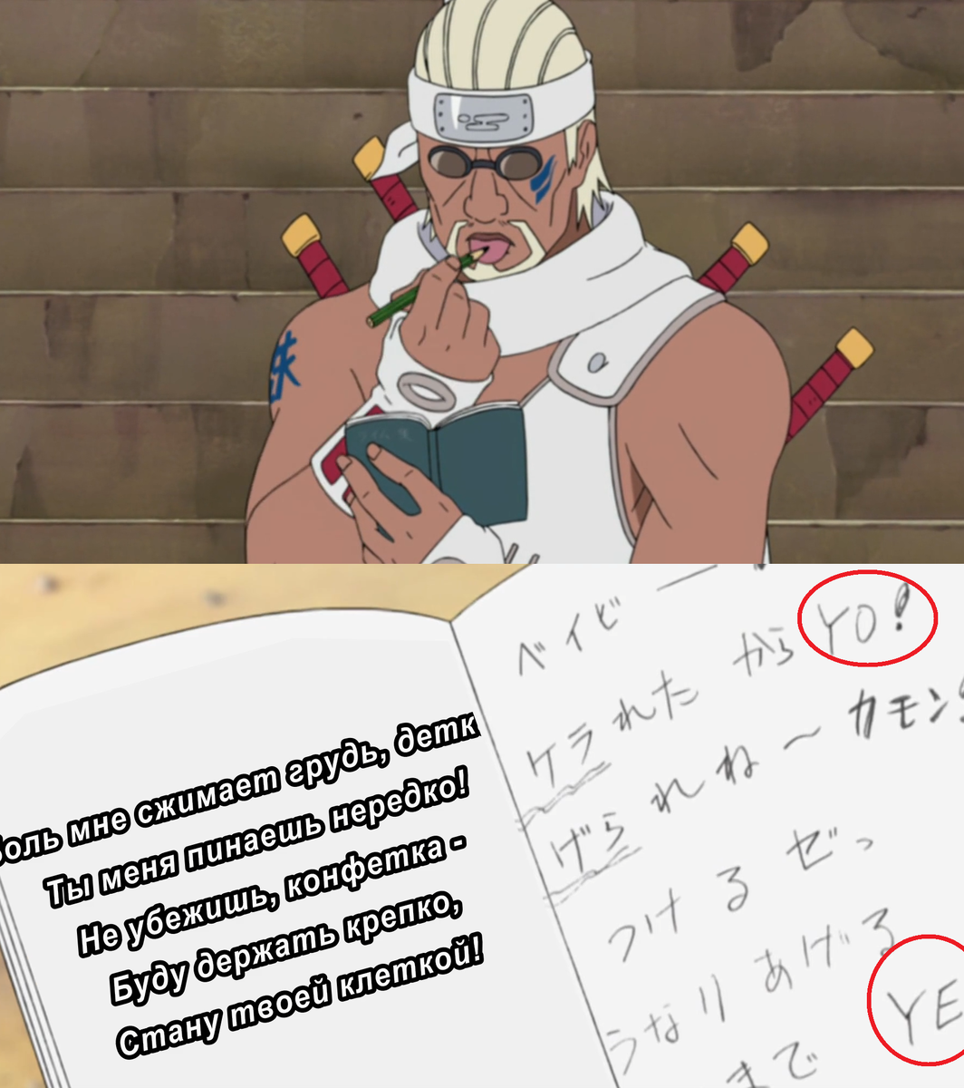 Кстати, следует отметить, что рядом с иероглифами вполне чётко на латинице приписаны "ЙО" и "ЙЕ", которые Би обожает вставлять между слов. Хм... очередное доказательство того, что мир "Наруто", это мир пост-апокалипсиса и всякие Северные Америки существовали когда-то там?