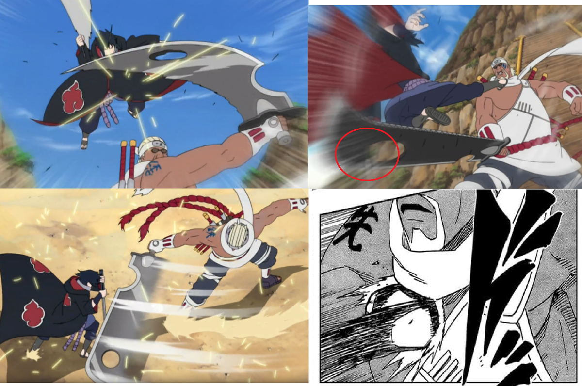 После провала Джуго и Суйгецу, в бой врывается "босс" - Саске неожиданно бросается в битву, тем не менее, Би успевает сориентироваться и начинает выполнять раскруточку громадным Обезглавливателем. Стоит отдать должное качеству Кусанаги Саске, который не погнуло огромным Кубикирибочо - Саске смог остановить удар мускулистого Би, правда не выдержал всей энергии удара, от чего его начало уносить назад, однако и из этого положения удалось выбраться, ловко подпрыгнув, завертевшись юлой в воздухе, а кроме того - с помощью Шарингана прочитать траекторию движения Би, в результате чего вонзить свой меч ровно в дыру внутри лезвия Обезглавливателя(дыра, кто не знал, нужна для уменьшения массы орудия), в следствие чего движение Джинчуурики полностью остановились, а Саске смог оказаться в выигрышном положении и нанести свой первый удар с ноги в грудь...