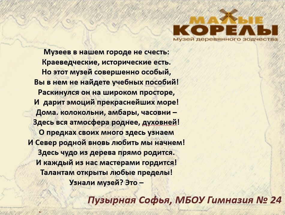 Когда мы проводим творческие конкурсы, дети и взрослые присылают стихотворения, которые сочиняют о «Малых Корелах». Часто это загадки в стихах. Вот, например, такая, от ученицы средней школы №28 Надежды Шохиной: