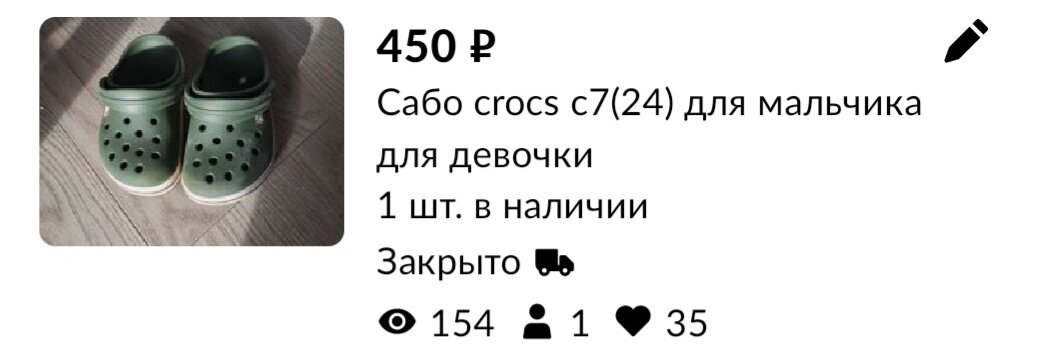 Вчера состоялось 2 личных продажи: одна через авито, другая через соседскую барахолку. Все проданные вещи - не мои, а моей подруги, которая уезжает (теперь уже точно) на пмж в очень далёкую страну. Скоро поеду помогать паковать чемоданы. Как так получилось писала здесь Через авито нашлась покупательница на сабо crocs плюс на месте ещё присмотрела сандали тоже crocs. Сандали продала со значительной скидкой, т.к. во-первых вторая вещь в покупке, а во-вторых обувь возвратная. Их уже покупали через авитотдоставку, но вернули из-за ослабленных липучек. И действительно по краям липнут хуже. Поэтому отдала 2 пары обуви в одни руки за 600р. Мне остались 240р. Также встретились с соседкой - уже почти постоянной покупательницей. Она покупала зимний комбез реймовский (тоже вещь подруги, долговис был), а теперь забрала рубашечки. Причём её сыну они прилично на вырост, но она решила "такие замечательные рубашки" забрать сразу. Лот на авито был популярным, но по ним был всего один диалог с догов