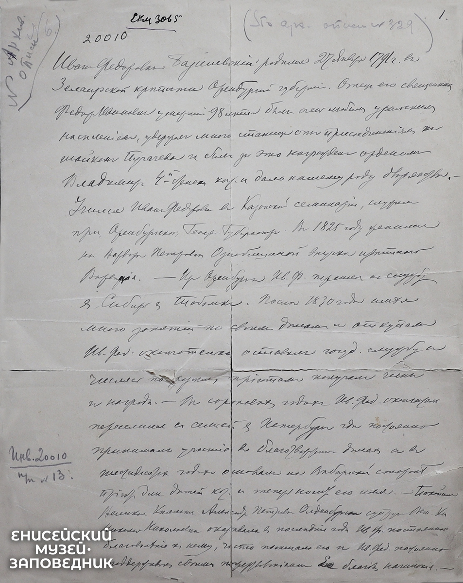 Среди рукописей дореволюционного периода встречается много разных по содержанию и форме документов, привлекающих наше внимание. Предлагаем ознакомиться сегодня с биографией Ивана Базилевского, написанного его сыном Виктором. Датирован документ 15 декабря 1903 года, и в книге поступлений зарегистрирован до 1 января 1904 года. Он состоит из двух плотных пожелтевших листов бумаги, исписанных с двух сторон черными чернилами мелким, не очень разборчивым почерком. Листы имеют сгибы, можно предположить, что их отправили по почте в конверте, но сопроводительного письма, подтверждающего это, при них нет. Документ сразу начинается с изложения биографии, что также указывает на необходимость такого письма с обращением к адресату. После прочтения документа создается впечатление о том, что Виктора Ивановича попросили написать биографию и при этом уделить внимание пребыванию их (Ивана Федоровича и Виктора Ивановича) в Енисейске, хотя сфера интересов Базилевских была разнообразна и имела широкую гео