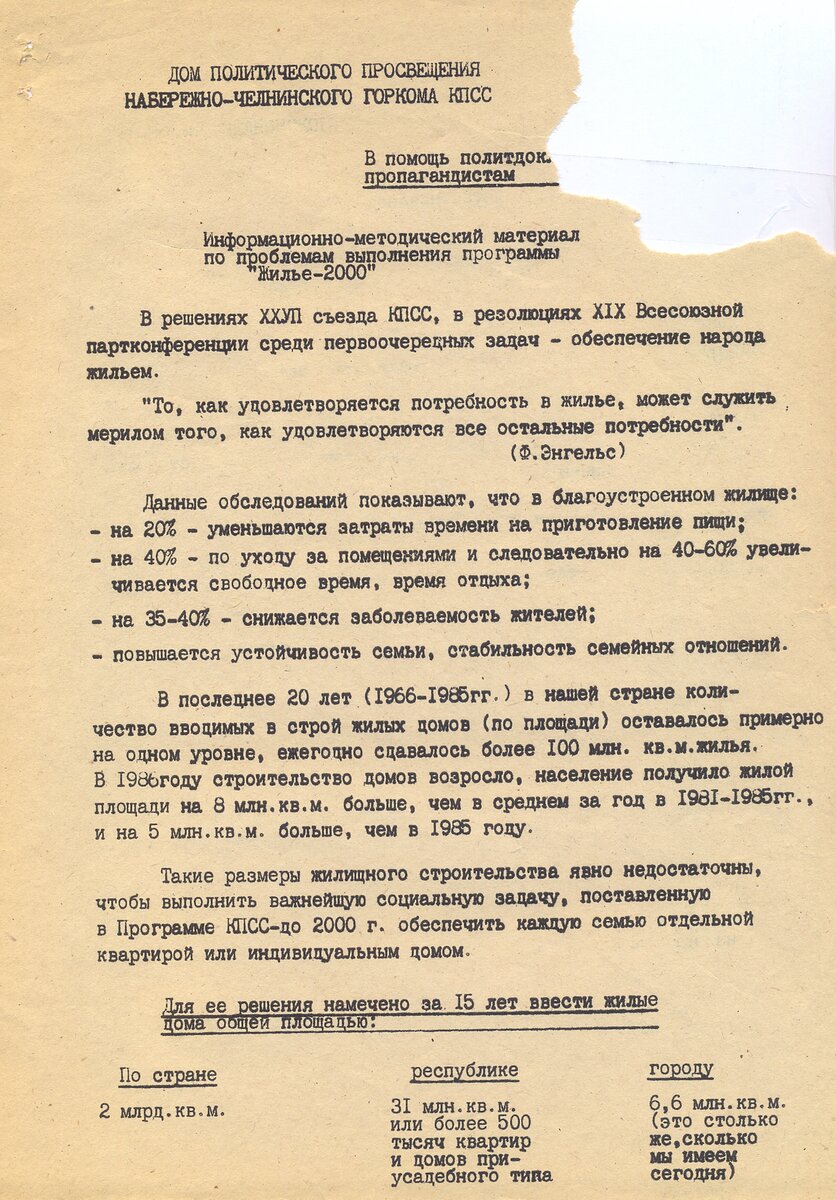 Помните, в середине 1980-х годов генеральный секретарь ЦК КПСС Михаил Горбачев пообещал, что к 2000 году каждая советская семья должна была получить отдельную квартиру или дом. Тогда же была принята государственная программа СССР «Жильё-2000». В Музее КАМАЗа хранится интересный информационно-методический материал по проблемам выполнения этой программы в городе Набережные Челны. Документ был подготовлен сотрудниками Набережночелнинского горкома КПСС в помощь политдокладчикам и пропагандистам в 1988 году. Изучая документ, обратите внимание и на то, что под индивидуальную застройку в нашем городе уже с 1989 года предусматривалось выделить 1268 гектаров земель, а именно в районе деревни Большая Шильна - 250 га, Ильбухтино – 400 га, Сидоровке - 60 га, в районе деревни Азьмушкино - 300 га.