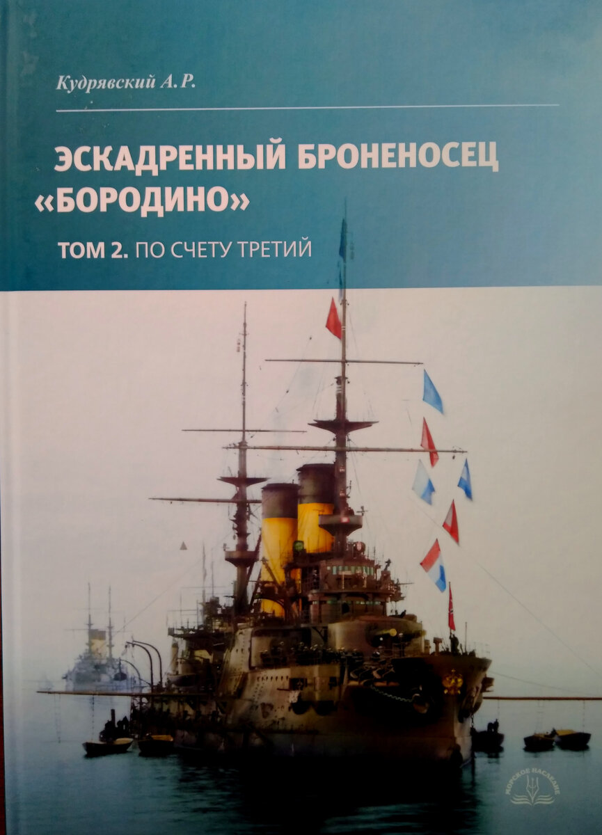 Том именной - имеет собственное название: "По счету третий". Тираж такой же - всего 500 экземпляров, было бы странно если он был больше или меньше, хотя встречались и такие примеры. Итак, книга имеет следующие выходные данные - Кудрявский, А. Эскадренный броненосец "Бородино". - в 2-х томах. - Т.2.По счету третий/ А.Р.Кудрявский. - СПб: Морское наследие, 2022. -308 с. Интересно, что по объему - те же 308 с, что и первый том, завидное постоянство,) Название второго тома символично - очевидная отсылка к номеру в строю кильватера в ходе Цусимского боя. Книга продолжает освещать подробности строительства броненосца "Бородино" и его переход к месту сражения.