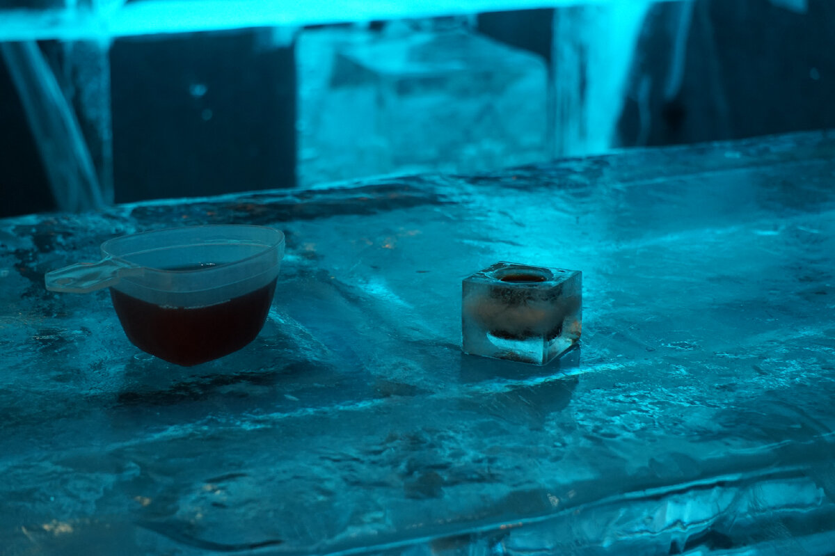 Наливают либо в пластиковые многоразовые стаканы, либо в стопки изо льда. Названия и напитки интересные, с северным колоритом. С соком бузины, например, или морошки.