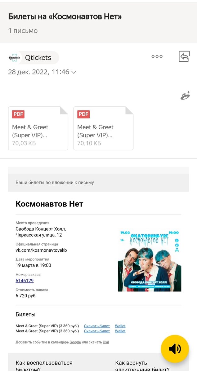 Все банально просто: приобрела для дочек 2 билета на концерт т.н. группы "Космонавтов.нет" в Екатеринбурге на 19 марта в концерт холл "Свобода". Билеты приобретались через сайт Qtickets.ru. За день до концерта в группе ВК появляется инфа об отмене. При попытке возврата билетов, Qtickets.ru ссылается на организатора и почему-то отправляет разбираться к нему: ИП Бабурин Александр Александрович, хотя в чеке (НКО Монета ООО) получателем является кьютикетс. Ну, как и следовало ожидать: на электронные письма никто не отвечает, номеров телефонов нет ни у Qtickets.ru, ни у Бабурина А.А. В группе ВК Космонавтов.нет тоже на обращения не реагируют. Считаю, что данное кидалово планировалось дружненько. Знаю, что дура! Не проверила организаторов перед покупкой билетов. Не будьте такими, как я! Проверяйте всё и всех. И НИКОГДА, ни в коем случае не связывайтесь ни с Космонавтов.нет, ни с Qtickets.ru, ни с ИП Бабурин Александр Александрович. Пост автора irinakirova. Узнать, что думают пикабушники.