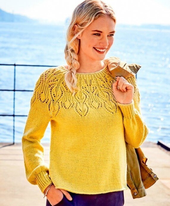 РАЗМЕР 38/40 ВАМ ПОТРЕБУЕТСЯ Пряжа (75% натуральной шерсти, 25% полиамида; 125 м/50 г) — 450 г желтой; длинные и короткие круговые спицы №4; для планок рукавов 1 комплект чулочных спиц №4. УЗОРЫ И СХЕМЫ ВРЕМЕННЫЙ НАБОР ПЕТЕЛЬ Использовать нить контрастного цвета достаточной длины. * 1 петлю рабочей нити захватить под нитью контрастного цвета, затем 1 петлю рабочей нити захватить над нитью контрастного цвета, от * постоянно повторять до получения требуемого числа петель. ЛИЦЕВАЯ ГЛАДЬ Круговые ряды: только лицевые петли. Ряды в прямом и обратном направлении: лицевые ряды — лицевые петли, изнаночные ряды — изнаночные петли. АЖУРНЫЙ УЗОР Число петель вначале кратно 25 = вязать согл. схеме. На ней даны нечетные круговые ряды. В четных круговых рядах петли провязывать по рисунку, лицевые скрещенные вновь провязывать лицевыми скрещенными, накиды провязывать лицевыми. Раппорт постоянно повторять. Выполнить 1 раз 1—60-й ряды. За счет обусловленных узором убавок число петель после 60 круговых р