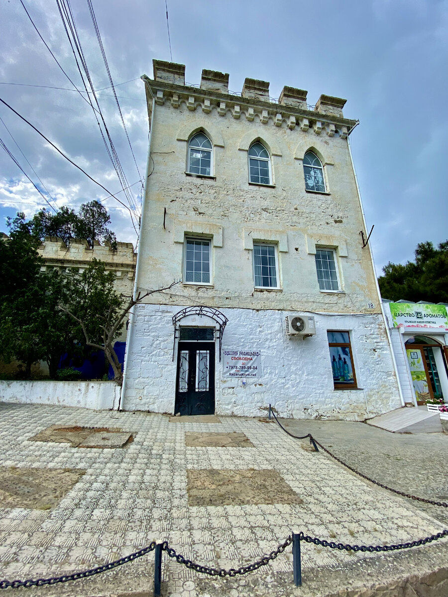 Это строение, фортификационного стиля, состоит из четырёх башен, соединённых крепостной стеной. Наша, "Восточная башня". Это трёх этажное строение ( на фото), толщина стен около метра, высота комнат более четырёх метров. Большие окна выходят на юг, много солнечного света и свежего воздуха. За окнами, прямо перед Вами, море, скалы, зелёный ковёр парка, и купола храма.