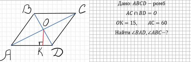 Здравствуйте, уважаемые читатели. В этой статье рассмотрим задачу из задания №23 ОГЭ по математике. Это геометрическая задача на вычисление. Бояться второй части ОГЭ не надо. Задание №23 оно почти такое же по простоте, как и задачи из первой части ОГЭ Единственное требование - это написать решение задачи, а не угадать ответ. Давайте начнем. Расстояние от точки пересечения диагоналей ромба до одной из его сторон равно 15, а одна из диагоналей ромба равна 60. Найдите углы ромба Построим рисунок и запишем дано Решение 1) Так как диагонали в параллелограмме точкой пересечения делятся пополам, то 2) Рассмотрим треугольник АОК - прямоугольный. АО=30, ОК = 15 (по условию), значит по свойству прямоугольного треугольника (если катет прямоугольного треугольника равен половине гипотенузы, то угол, лежащий против этого катета, равен 30 градусов). Получаем, что: 3) Диагонали в ромбе делят углы пополам, значит: Спасибо, что дочитали. Вы меня очень поддержите, если поставите лайк и подпишитесь на