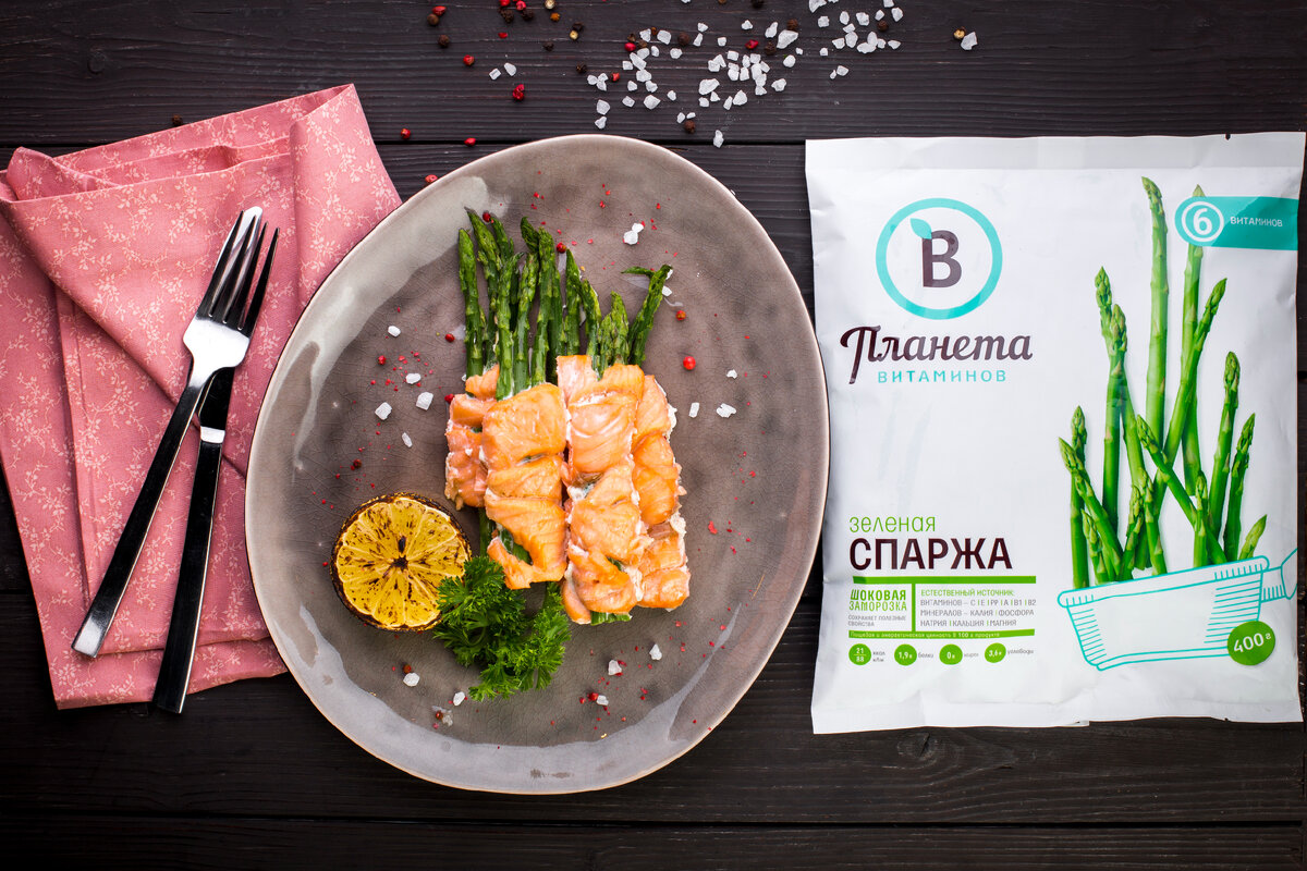 3. Оберните 2–3 стебля спаржи полоской лосося.