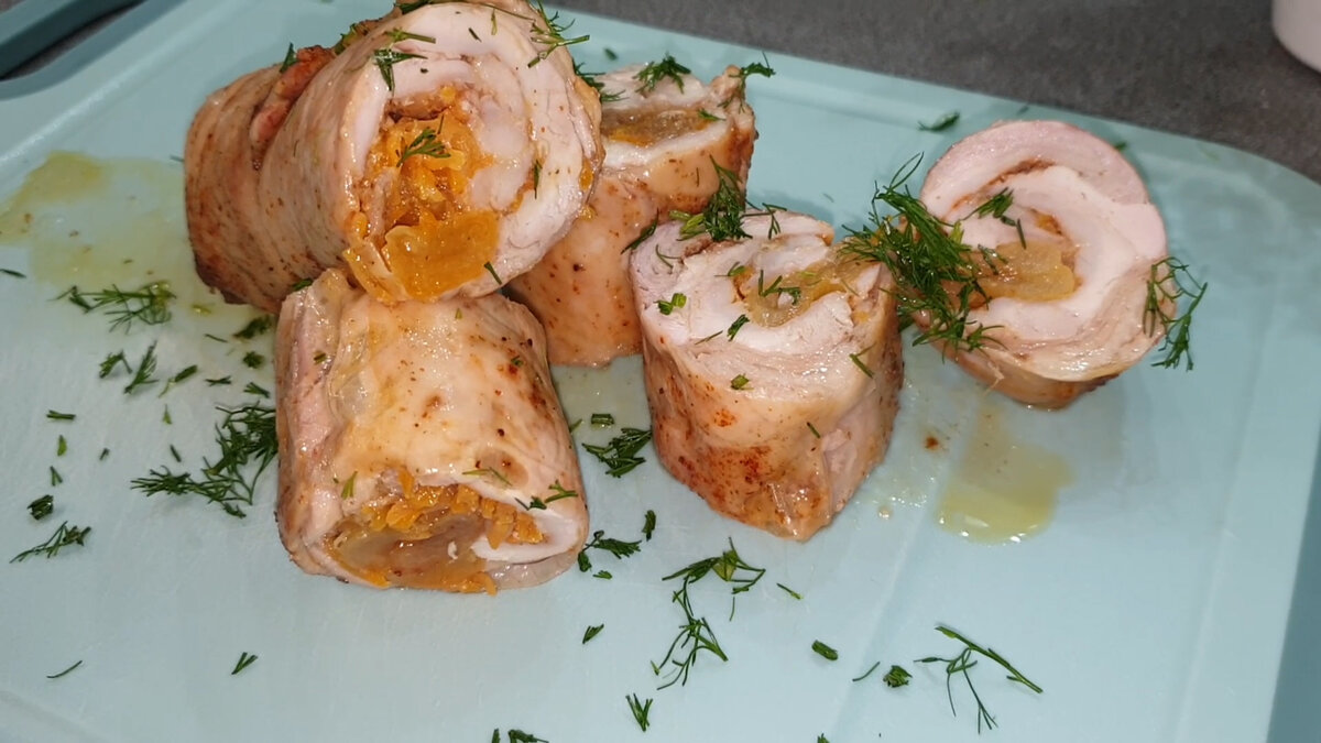 Снимаю кожу с тушки курицы и мне понадобятся 2 окорочка. Срежу мякоть с куриных окорочков и отобью это мясо. Накрываю пакетом и отобью скалкой Готово. Добавляю соль- 2/3 чайной ложки Приправа уцхо - сунели 1/3 чайной ложки Молотая сладкая паприка - 1/4 чайной ложки Молотый сушеный чеснок - 1 чайная ложка Морковь по-корейски - 3 столовые ложки Выкладываю курагу без косточки-50 грамм Пищевую фольгу присыпаю сладкой паприкой -1 чайная ложка т.к в готовом рулете кожа будет бледной, присыпайте фольгу яркими приправами. Отбитую мякоть сворачиваю в рулет перекладываю на куриную кожу и плотно сворачиваю всё вместе. Плотно заворачиваю фольгу Я готовила сразу 2 рулета, всё готово. Готовый рулет можно оставить на 6 часов в холодильник, но необязательно, я отправляю в духовку запекать при температуре 180С 40 минут. За 15 минут до конца готовности фольгу разворачиваю и даю рулету зарумяниться Рулет готов, его можно горячим подавать к столу, а можно и холодным. Он очень аппетитный и вкусный! Отлично