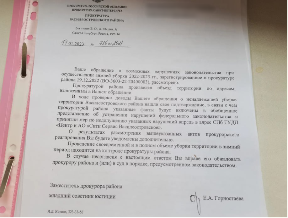 Комитет по благоустройству Петербурга фактически указал в отзыве на исковое заявление, что основная функция Комблага – это своевременное заключение контрактов с подрядчиками. При этом в Комитете настаивают, что ответственность за уборку города заканчивается на том моменте, когда заключен договор с подрядчиком. Но тогда возникает резонный вопрос: зачем нужны чиновники Комитета и собственно сам Комблаг, если его обязанность заключается только в этом? «Комитет является органом государственной власти Санкт-Петербурга, представляя интересы города, обеспечил выполнение Санкт-Петербургом надлежащим образом уборку Василеостровского района Санкт-Петербурга путем заключения государственного контракта с организацией СПб ГУДП «Центр», чем принял все меры для надлежащего исполнения своих обязательств по уборке территории. Таким образом Комитетом были предприняты меры по устранению снегопадов», — такова выдержка из пояснений Комитета по благоустройству Санкт-Петербурга, представленного в материалы с